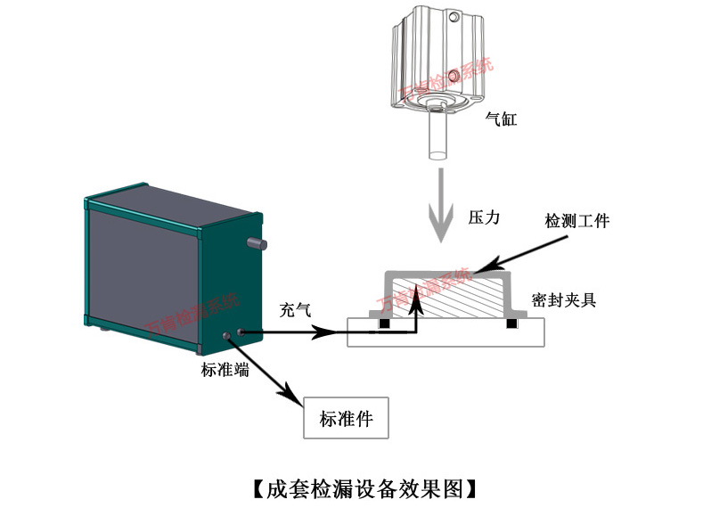 检测:三个气阀都关闭,若待测工件有泄漏,该待测工件端压力低于标准端,差压传感器显示为正数,若待测工件压力高于标准端压力,差压传感器显示为负数。